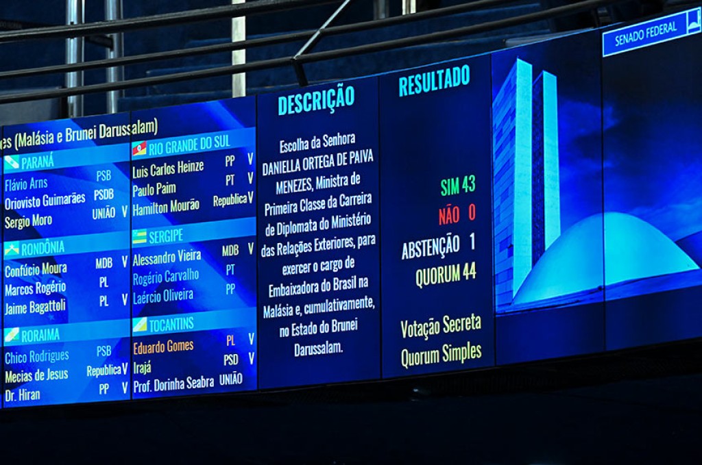 O Plenário do Senado aprovou a indicação de Daniella Ortega de Paiva Menezes para o cargo de embaixadora do Brasil na Malásia e, cumulativamente, em