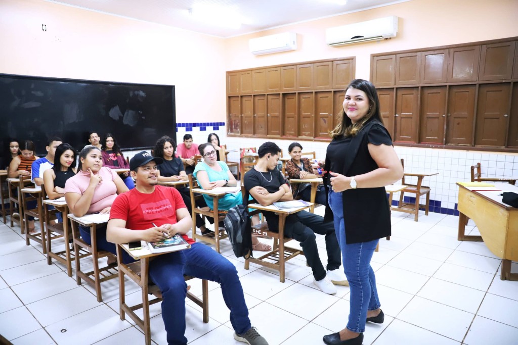 Profissional da Secretaria de Estado de Educação (SEE) acompanha alunos da EJA em sala de aula. Foto: Ascom/SEEO processo seletivo disponibiliza vagas para nível médio, técnico ou superior, e o contratado vai realizar atendimento prioritário às turmas do período noturno.