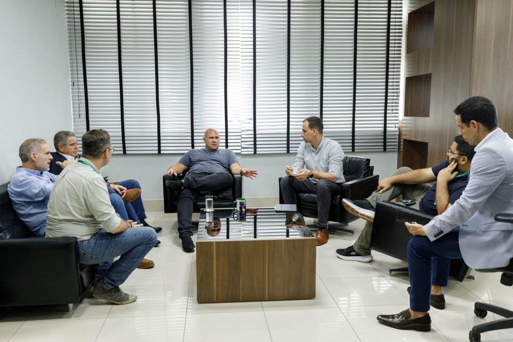 Na imagem principal o prefeito Abilio Brunini, de camiseta cinza e calça jeans, conversa com representantes da Famato. Todos estão sentados em poltronas pretas atentos durante uma reunião que definiu o local do evento.