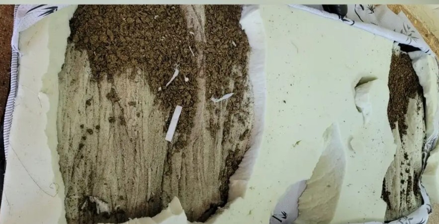 Ao manusear o colchão, o servidor identificou o cheiro forte da droga e, ao abrir o objeto, encontrou o entorpecente escondido entre as espumas.