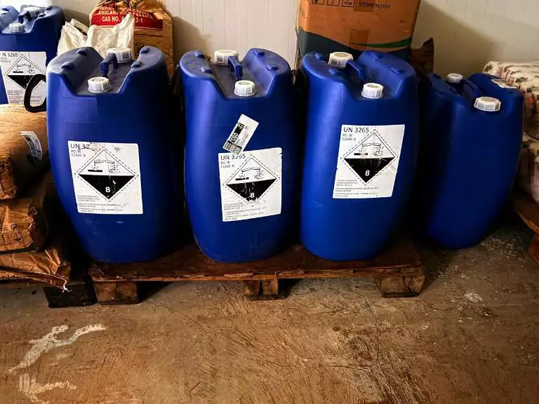 No local, que operava sob o nome Indústria e Comércio de Bebidas Terenos Eireli, os agentes encontraram rótulos e tampas falsificadas da marca “Shirlof”, de vodka, além de garrafas prontas para venda, sacos de ácido cítrico e compostos químicos usados na adulteração de bebidas.
