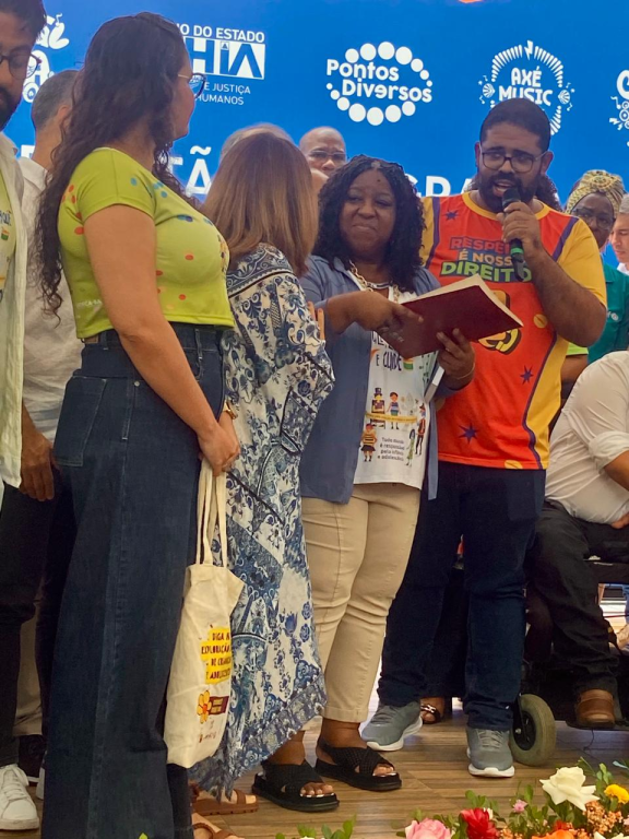 Durante o evento de lançamento, a superintendente Fátima Freire entregou cartilhas e materiais informativos sobre o combate ao trabalho infantil à ministra dos Direitos Humanos, Macaé Evaristo. A SRTE/BA, por meio do MTE, atuará ativamente no plantão integrado ao longo do Carnaval para garantir a segurança e os direitos das crianças e adolescentes.