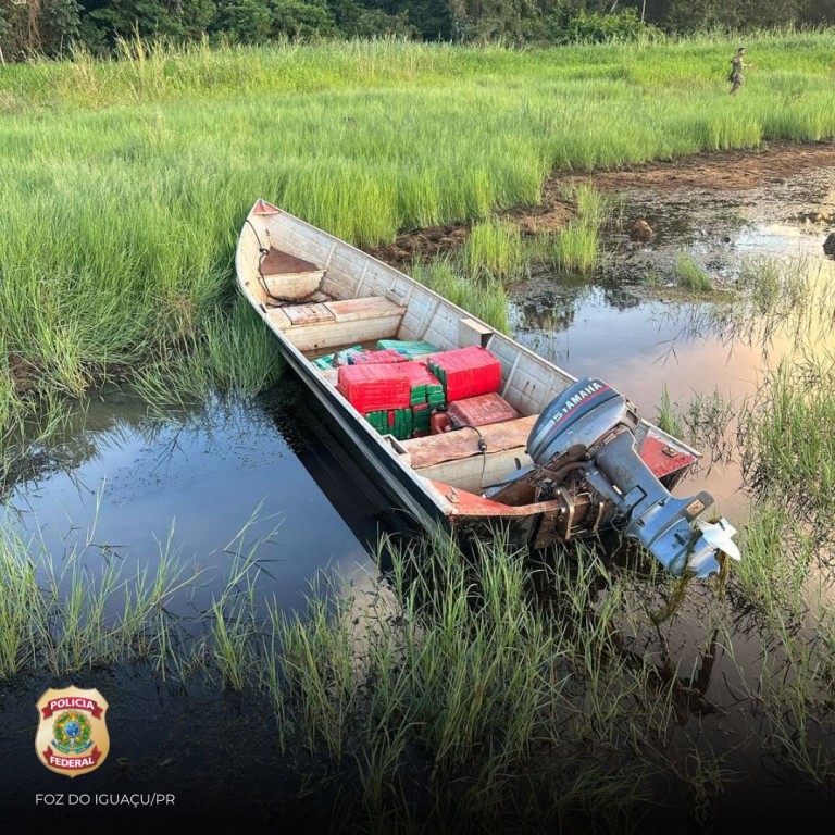 Foz do Iguaçu/PR. Nesta sexta-feira (28/2), a Polícia Federal apreendeu uma embarcação carregada com 150 quilos de maconha após sua travessia pelo Lago de Itaipu e atracagem em uma área rural do município de Missal.