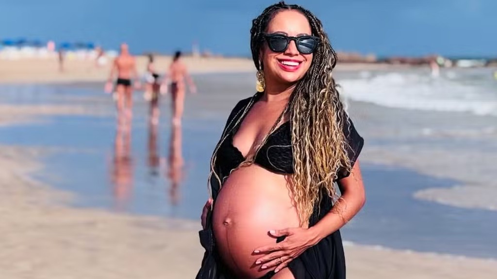 A atriz Aretha Oliveira, famosa por ter vivido a órfã Pata na primeira versão brasileira de Chiquititas (SBT, 1997/2001), exibiu o barrigão da gravidez ao compartilhar um álbum de fotos na praia.