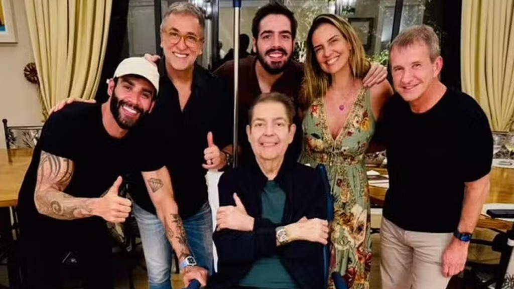 O apresentador Faustão, de 74 anos, deu um jantar em família e recebeu Gusttavo Lima, nesta quarta-feira (26). O registro do encontro foi compartilhado no Instagram por Luciana Cardoso, esposa do apresentador e também pelo filho dele, João Guilherme.